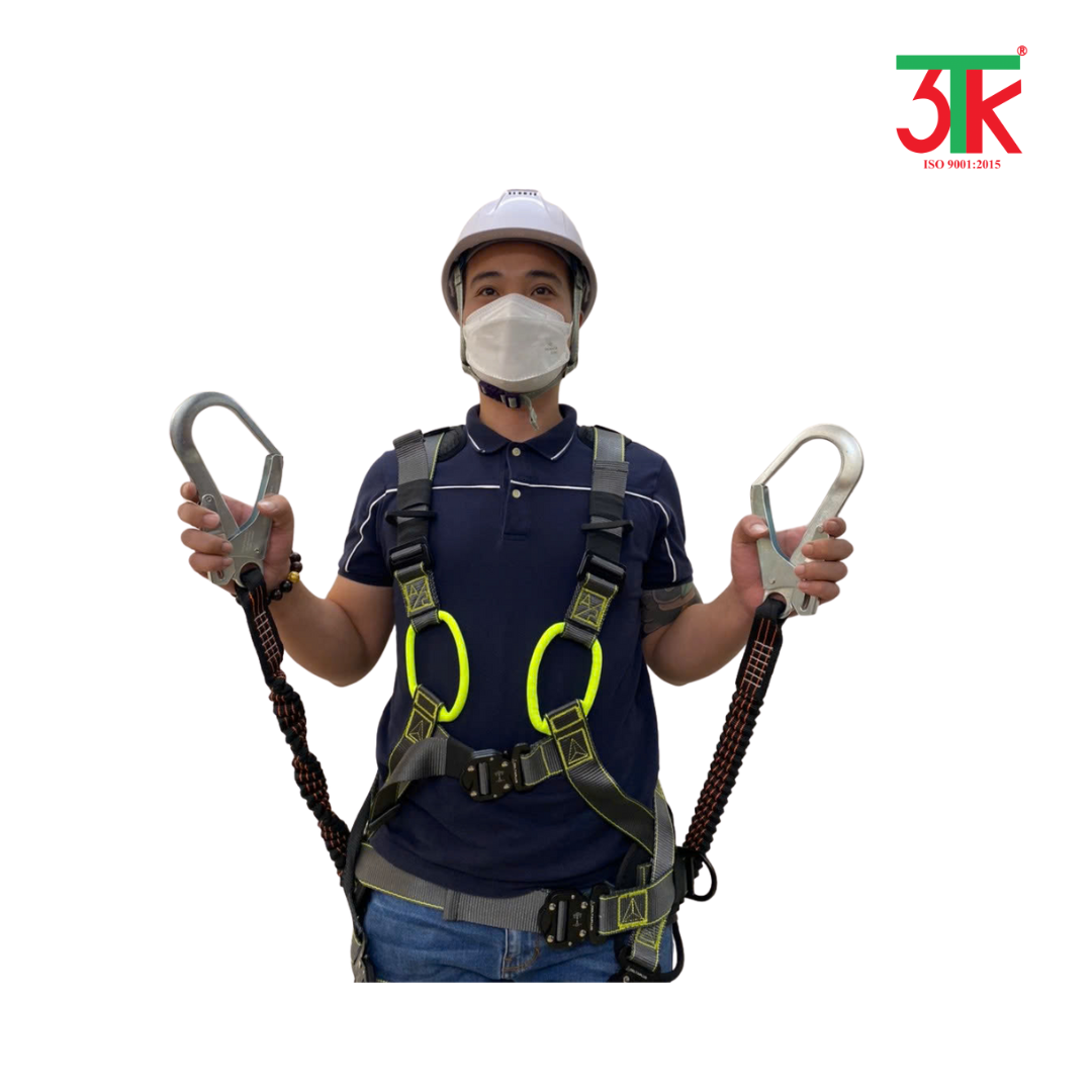 - Carabiner và móc khóa: chế tạo bằng thép mạ kẽm cao cấp, chịu được lực kéo lớn, không han gỉ, bảo đảm kết nối vững chắc giữa dây và điểm neo.