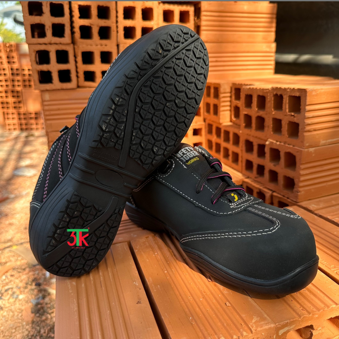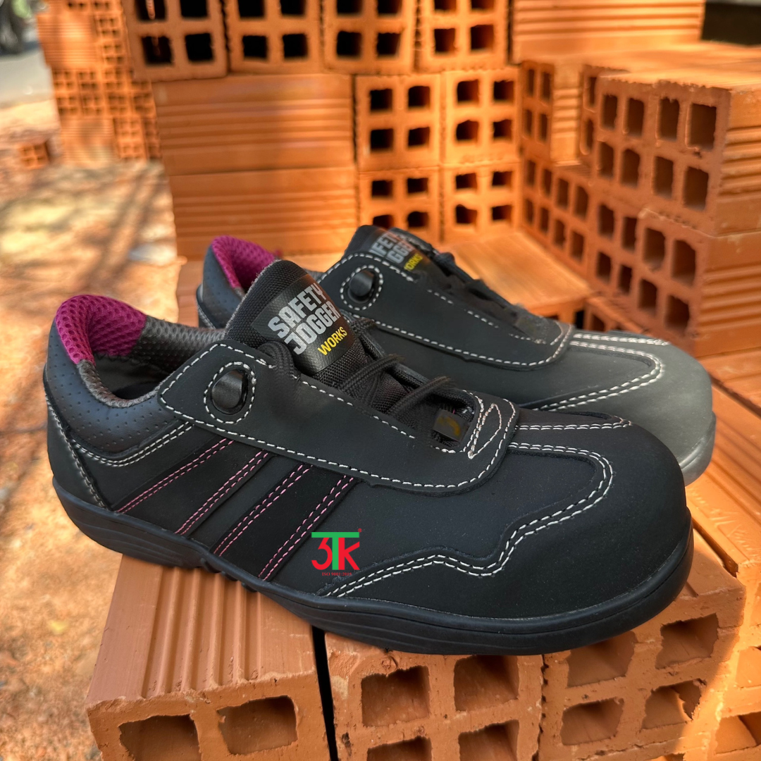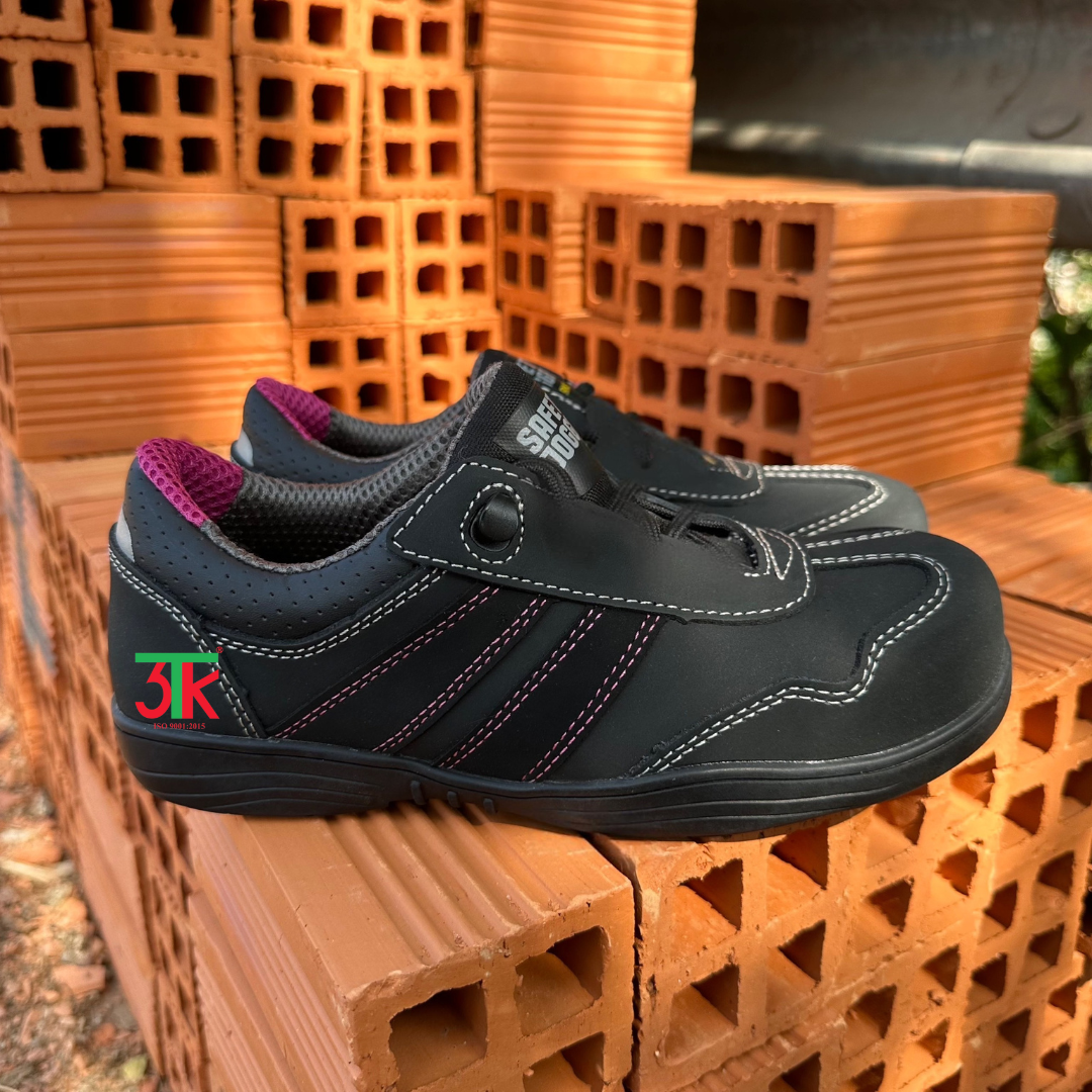 Theo thông tin từ 3TK, sản phẩm này thuộc thương hiệu Safety Jogger của Bỉ, với màu đen tím, chất liệu da PU cao cấp, mũi giày composite, thân giày chống thấm, chống tĩnh điện và có tấm lót SJ Flex chống đâm xuyên.